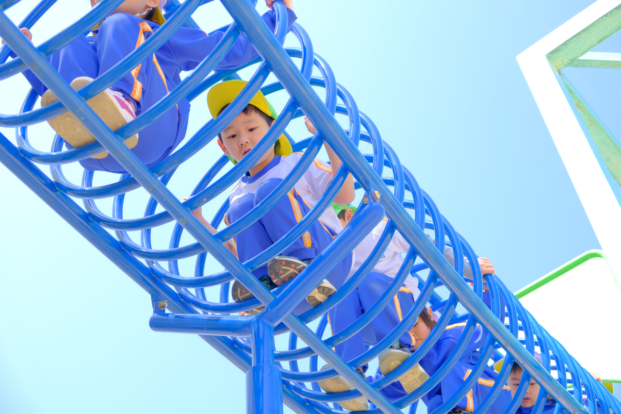 「Hello~ Ms.〇〇~!」と遊具の上から先生に手を振る姿。